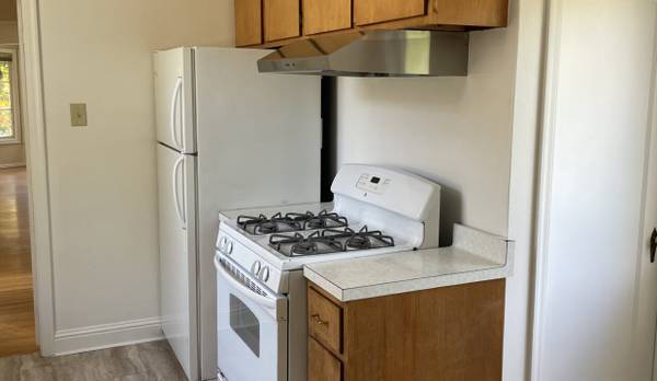 Kitchen has has a gas stove, fridge and dishwasher.