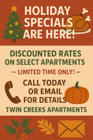 Celebrate the season with discounted rates on select apartments - available for a limited time only! Call us today or email for details and make your move before the new year!
