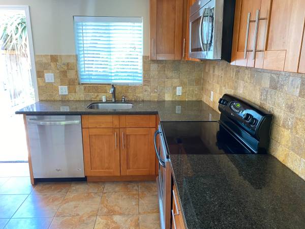 Lovely, remodeled apartment in a duplex. Feels like a house. Practical layout with open concept living room and kitchen, half bathroom, and washer and dryer on the first floor. Kitchen opens to a patio and small garden with a mature lemon tree. Second floor has 2 bedrooms with ample closets, full bathroom and a large deck with views off one of the bedrooms. Hardwood floors in all rooms and porcelain tile in kitchen and bathrooms. Large kitchen with granite counters, stainless steel appliances; sink disposal, and washer and dryer. All windows are double-paned with blinds.