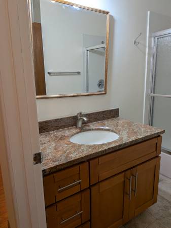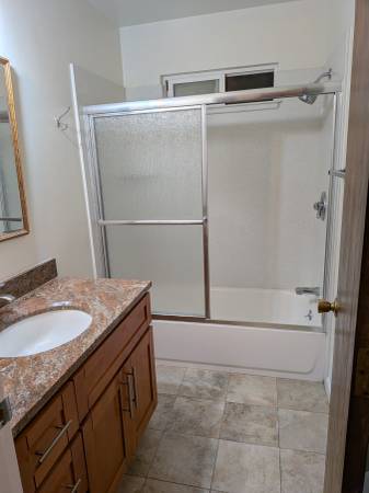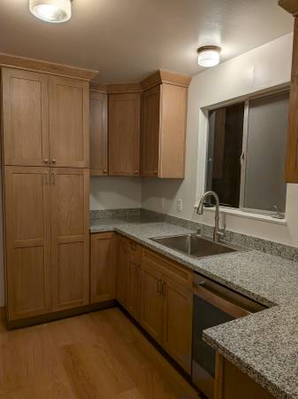 3 bedroom, 2 full bath house, huge 2 car garage, separate dining area, and large fully fenced yard with mature fruit trees, flowering shrubs, and plenty of gardening space. Newly remodeled kitchen with new cabinets, stainless steel sink, granite counters, stove, dishwasher, hood, flooring and new paint throughout. The kitchen has plenty of cabinets and counter space. Hardwood floors throughout the house. Both bathrooms have granite and quartz countertops, tile floors, and marble showers. Washer and dryer are available for laundry inside the garage. This is great home for families and anyone looking for more space at an affordable rent.