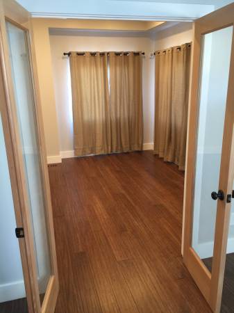 - Dark bronze fixtures, door knobs, and curtain rods and cloths curtains throughout.