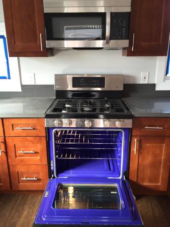 - High end stainless steel appliances (36" french-door fridge with filtered ice and water dispenser, self-cleaning 5 burner gas range, 9" deep large sink with high power garbage disposal, microwave hood, dishwasher).