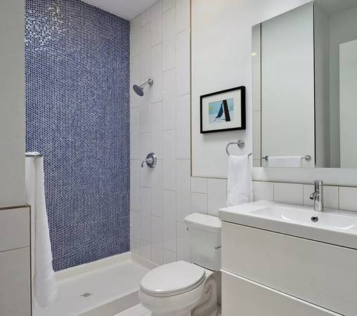 The home's modern design is evident in every detail. The bathroom features dual sinks, contemporary fixtures, and a stylish blue-tiled shower area. The open-concept living and dining area is perfect for entertaining, with large sliding glass doors that lead to a private outdoor space. Natural light floods the living areas, highlighting the sleek lines and modern finishes. Additionally, the unit includes an in-unit laundry and a designated parking space.