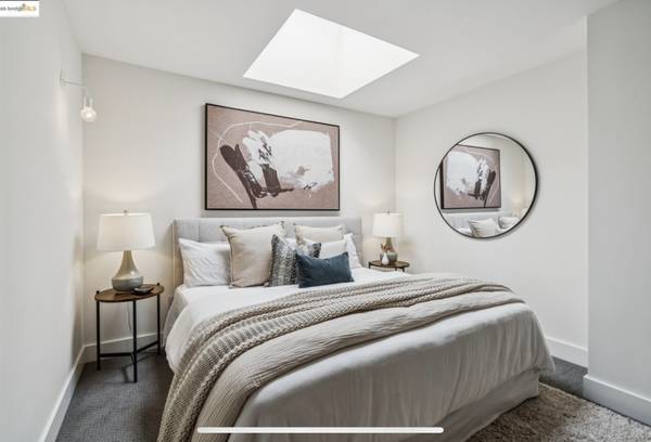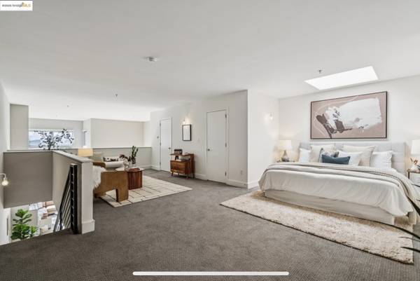 Upstairs, the loft-style bedroom is an airy retreat w/ room for large furnishings plus a lounge or workspace. There are two skylights that provide excellent natural light, and the ensuite bathroom has the aforementioned double sink with a custom vanity. If you have the shades at the top of the large windows pulled up, you can see a view of downtown Oakland from upstairs.