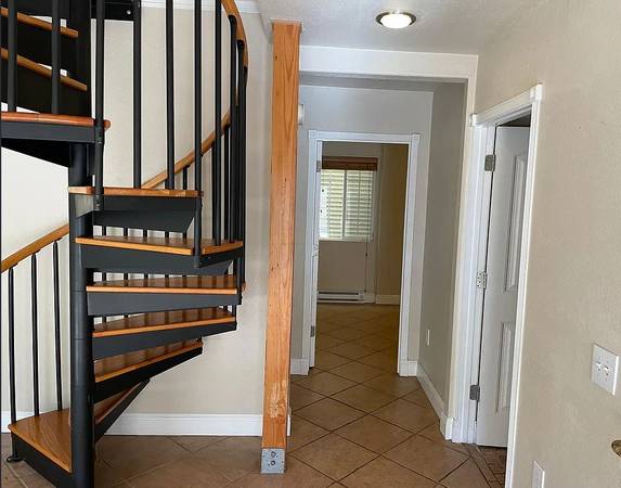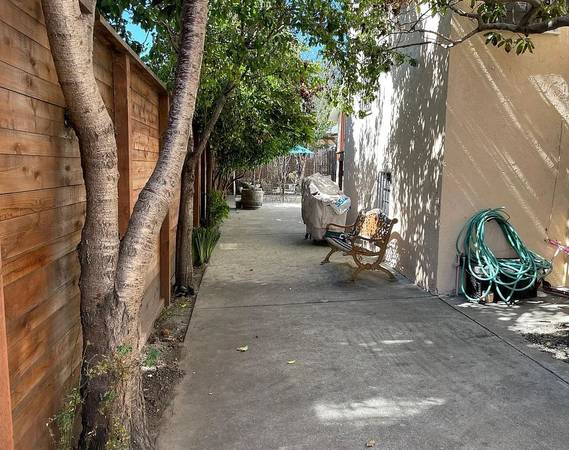 The outside area features a patio with metal table, chairs, large mature fruit trees, and a large decorative canvas umbrella. Home is part of a triplex, but detached from the other two attached units. No common wall. Rental offers one, off-street parking space and a locked gated entry.