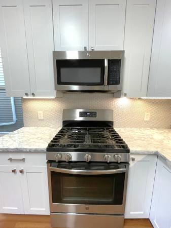 • Renovated kitchen with white Shaker cabinets, marble countertops, and penny tile backsplash