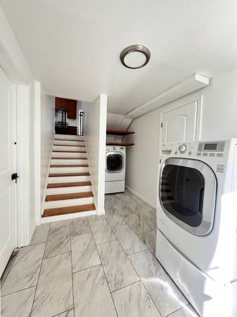 Updated appliances, with finished laundry room in basement(LG washer and dryer included). Air conditioning and central heat make the most confortable home. Primary bedroom has two-closets. Fully itrigated front and back yard. New roof, new paint, very clean: Additional storage room separate from garage. 2 off-street parking spaces - long alley driveway.