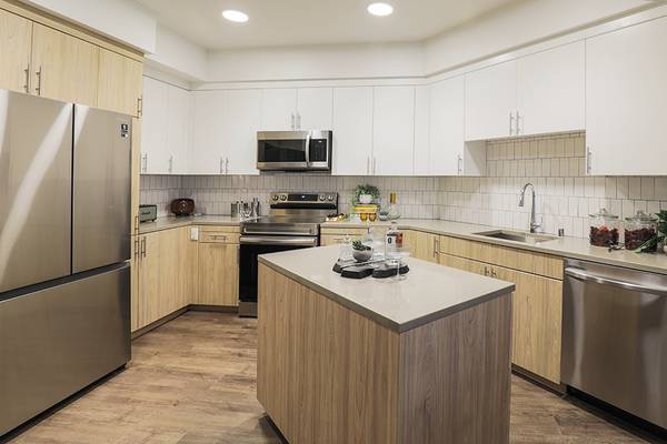 • Modern kitchen with quartz countertops and stainless-steel appliances