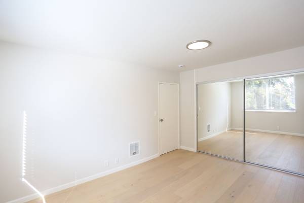Contemporary, second floor 2BR/1BA in Oakland's Civic Center neighborhood. Floors are hardwood except in bath. Large, semi-open living room is bright with a wall of windows and transitions into a dining space in front of the kitchen. Galley-style kitchen's all stainless appliances include an electric stove, dishwasher, microwave, and it offers lots of cabinets. Both bedrooms have wall closets with sliding mirror doors. Standard bath has shower-over-tub with sliding glass doors.