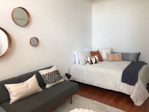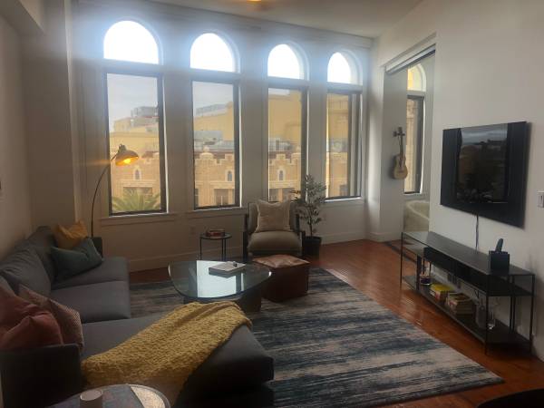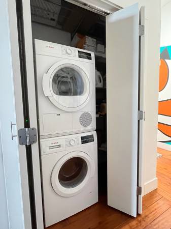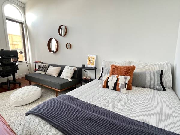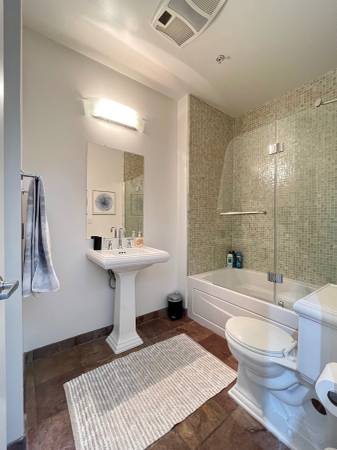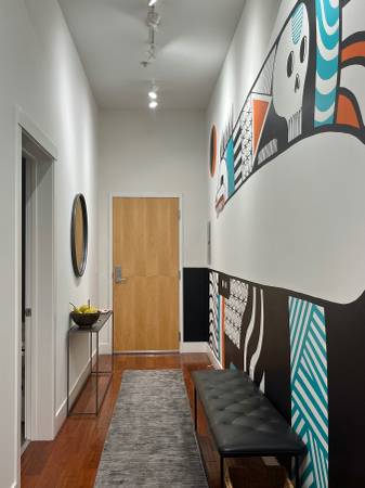 Open floorplan with high ceiling and large window wall-includes stylish living room with flatscreen tv, dining area and fully appointed kitchen. One lounge/bedroom off livingroom with sliding door for privacy-has one full bed and one single bed and closet. Main private bedroom off hallway with luxurious king bed, flat screen tv, desk, 2 closets, and own full bath with tub/shower. Also another full bath with tub/shower in hallway. Additional closet in hallway and full laundry. Hardwood thru out apartment. Black out shades in all windows.