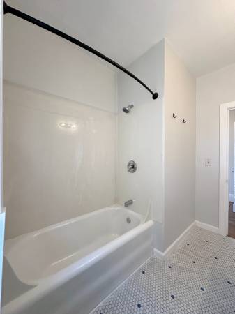 Bright bathroom with pedestal sink, hex tile floors, shower-over-tub, and window