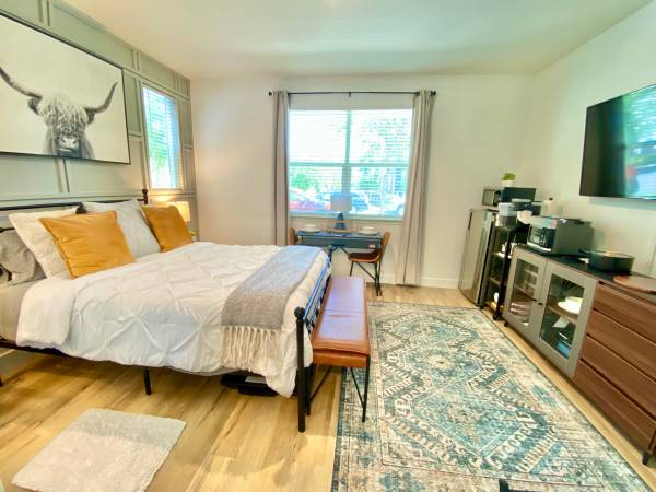 ✨ Room also includes a desk/dining table, 2 chairs, a bench, and a 55” Samsung flat screen TV with Roku streaming for free movies/shows (personal account is necessary to access apps such as Netflix, Amazon Prime TV, YouTube, Hulu, Tubi, etc.