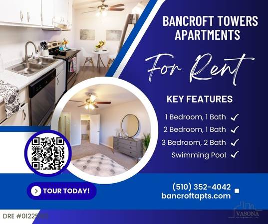 At Bancroft Towers in San Leandro, California, San Francisco Bay Area, you’ll enjoy the ideal urban experience – walkable, enjoyable, exceptional. Your pet-friendly 2-bedroom apartment is your ticket to everything you love about San Leandro at your fingertips – on-trend dining, shopping, entertainment, and more.