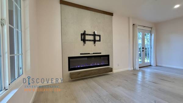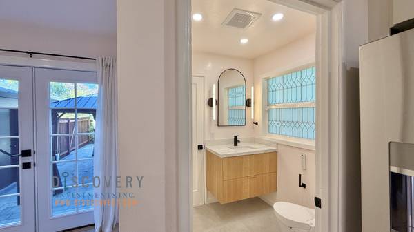 Entering into an open concept living area, the heart of the home is the stunning kitchen, adorned with sleek quartz counters and modern cabinetry that perfectly complement the chic engineered flooring. Admire the seamless integration of high-end appliances, creating an inviting space that effortlessly caters to your culinary desires. The dishwasher and air conditioning provide the ultimate in convenience, ensuring that every moment spent here is a delight. A half bath is conveniently located off of the kitchen. The hallway leads to a bedroom suite with a contemporary, sharable bathroom. Two additional bedrooms complete the home.
