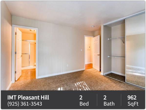 IMT Pleasant Hill is a community is comprised of classic and upgraded studio, one- and two-bedroom apartment homes located in the East Bay suburb of San Francisco, Pleasant Hills, CA. With distinctive features, residents can expect in-home amenities from wood-like flooring and open concept floorplans to private patios/balconies. The community boasts amenities such as two resort-style pools with BBQ grills, two newly renovated laundry facilities that are open 24 hours and credit card operated, and a newly renovated fitness center. With close proximity to the BART station, IMT Pleasant Hill gives residents an easy commute and all the best that the greater San Francisco area has to offer.