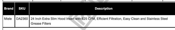 For our kitchen remodel we purchased this vent and it didn't fit. Cost $1400 and is brand new out of the box. We can deliver. Miele 24 Inch Extra Slim Hood Insert with 625 CFM, Efficient Filtration,...