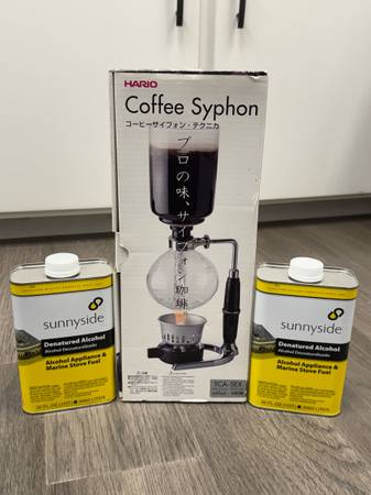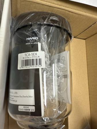 New, never used, Hario 5-cup burner TCA-5EX siphon coffee brewer. Also included are two (2) quarts of new, never opened, never used fuel for the burner. All original parts are included in the original box, which is in perfect condition. I’ve opened the box only to inspect the contents and photograph them. Shipping plastic still as placed by factory.