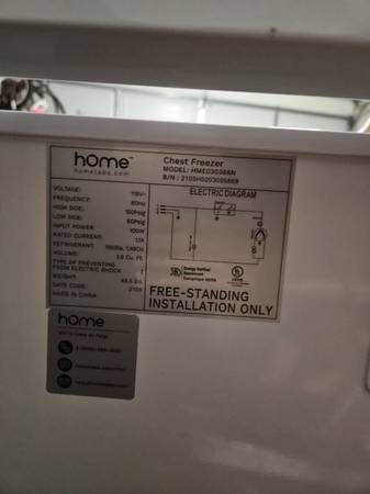 Garage-ready freezer in great condition, a few minor scratches. Clean, no smells. I had to upgrade to a larger freezer. It is easy to transport but as with most chest freezers, I'd only transport it upright. It must be picked up, I'm not able to deliver it.