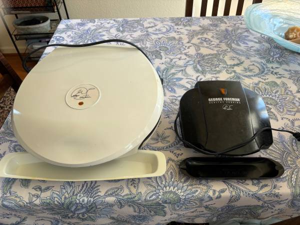 I have 2 George Foreman grills that work fine but I no longer use regularly, so cleaning out my cabinets. The small standard sized one has a grill area of approximately 8 x 6”, good for sausages, hot dogs, 1 or 2 hamburgers, 1 steak; asking $10. The XL sized one has a grill area of 14 x 10” (3 times as big), will cook a couple packages of sausage, several hamburgers or steaks, family or party size; asking $30.