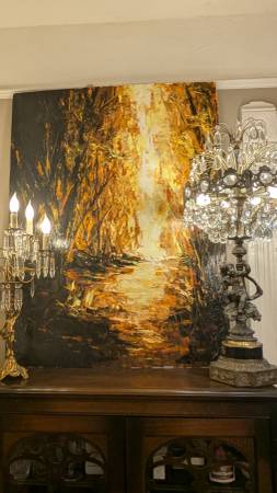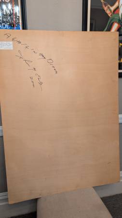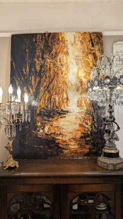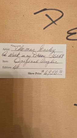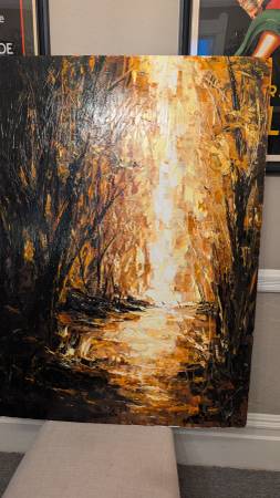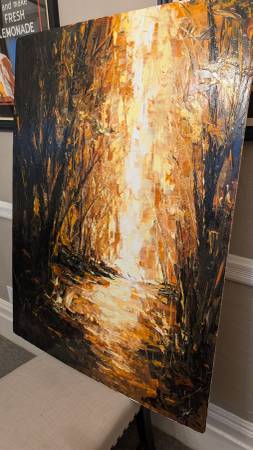 Thomas Easley : A Walk In My Dreams is The Title for This Fantastic Work of Art. Done in Acrylic Paint Depicting a Dark and Foreboding Landscape of Trees that shows a possible path to the Lighted edge . Is it Heaven on the other side ? It’s open to your own imagination..