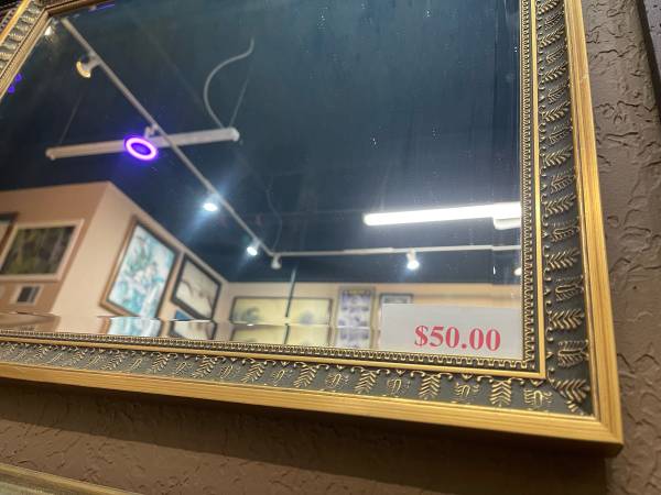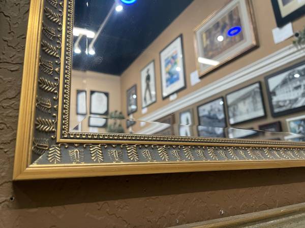 Custom framed ornate gold framed mirror Outside: 20” X 26” $50 Text