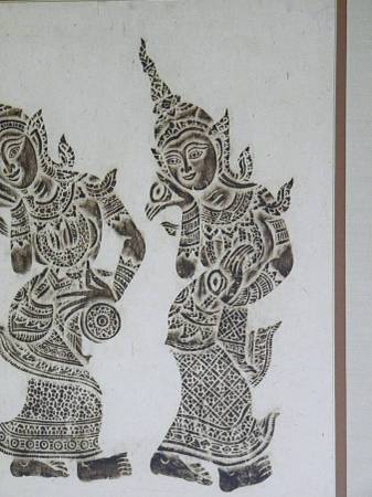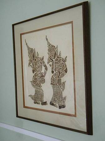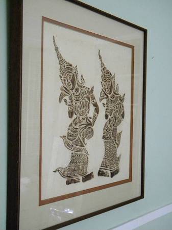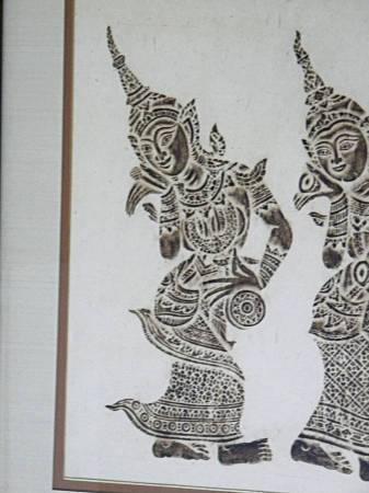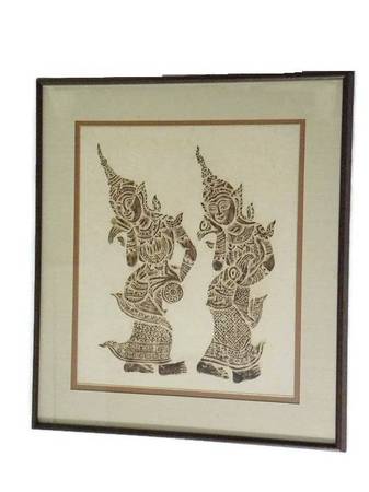 Vintage mid century authentic Thai temple rubbings of traditional Thai dancers on rice paper in brown. The art piece is frames in a solid wood frame, matted, under glass. The frame is also from 1960s. Excellent condition. No damages to the art piece. Minor nicks on the wood frame.