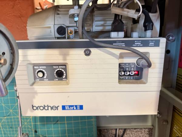 Brother industrial DB2-B737-413 sewing machine with servo motor. This machine is a beast, it can sew through pretty much anything you can fit under the pressure plate. When I first bought it, I’m meticulously cleaned and tuned it. It has several auto stitch options, including lock stitch. It has auto thread trimmer, I put it in storage for a couple years when I took it out, I had lost the cable and I’ve been using it without it.