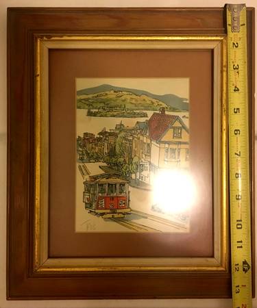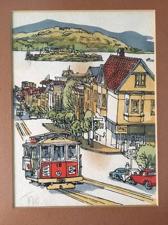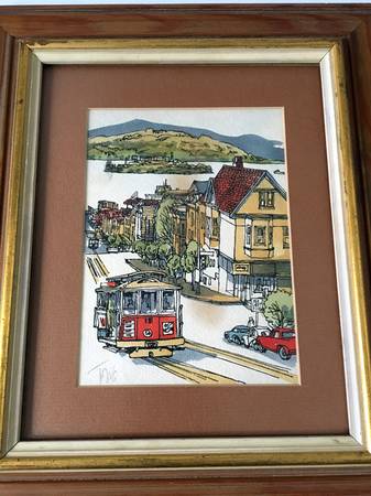 Vintage 1980s Martin Tang Signed Watercolor San Francisco Trolley Alcatraz. In Vintage Custom Frame. Dimensions: 13.1/2 x 11.1/2 Pick up only, please see images and let me know if interested.