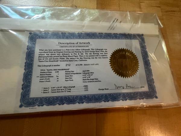 SANTA CRUZ BOARDWALK LITHOGRAPH IMAGE 4 1/2" X 36 1/2" SHEET SIZE 6 1/2 X 38 NUMBER TO 3,500