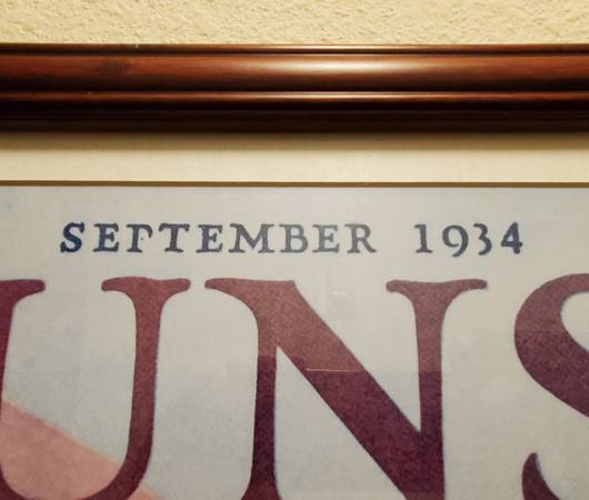 Sunset Magazine September 1934 poster by Maynard Dixon silhouette of a cowboy on his horse. Professionally mounted on wood and glass frame measuring 25" x 33". $160 cash only.