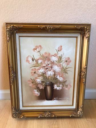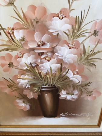 Real oil painting on canvas with signature, 16” x 21.5" including frame. Beautiful flowers, in excellent condition.