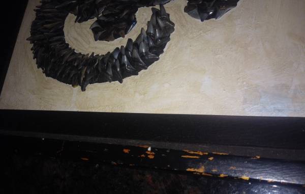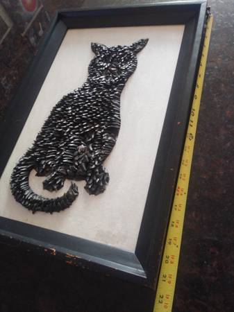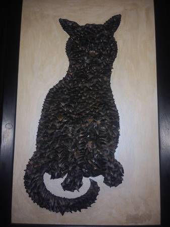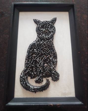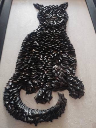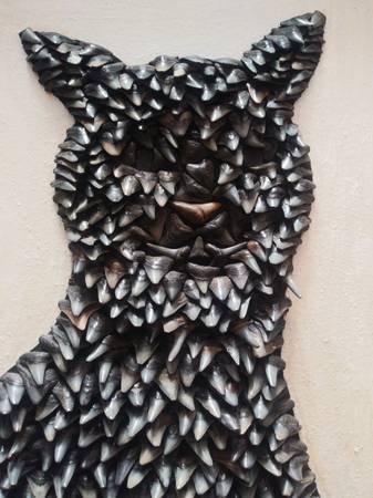 Cat Art for sale, artesanal piece it’s made with black color shark’s teeth (a few are lost, see pictures), size is 21 1/2”X 14 1/2” , condition is used in good shape, it’s a very unique piece !