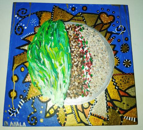 Pre-owned in good condition! One of a kind painting with dominant blue color and golden in a contemporary style, food dish is a Mexican Vegan plate which is Nopal (cactus), Beans, Pico de Gallo and rice, acrylic on canvas, size is 12"x12" painted by Mexican Artist D.Ayala in San Francisco. See pictures for reference! Pick up in San Francisco