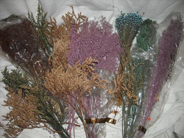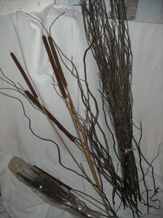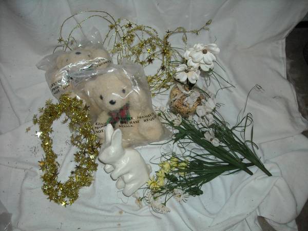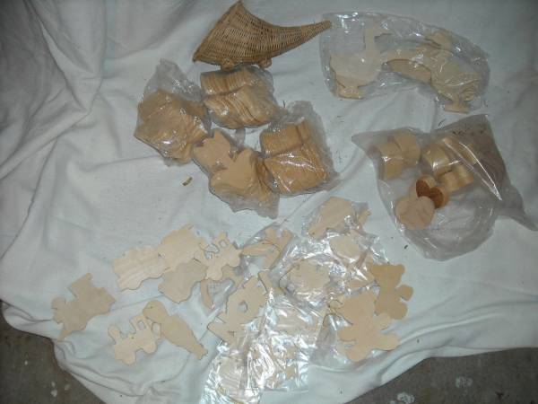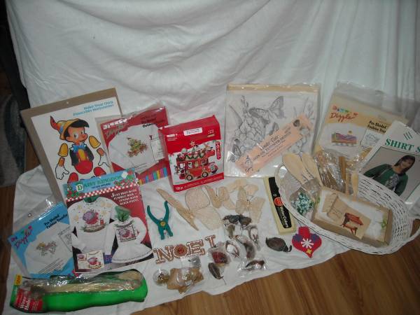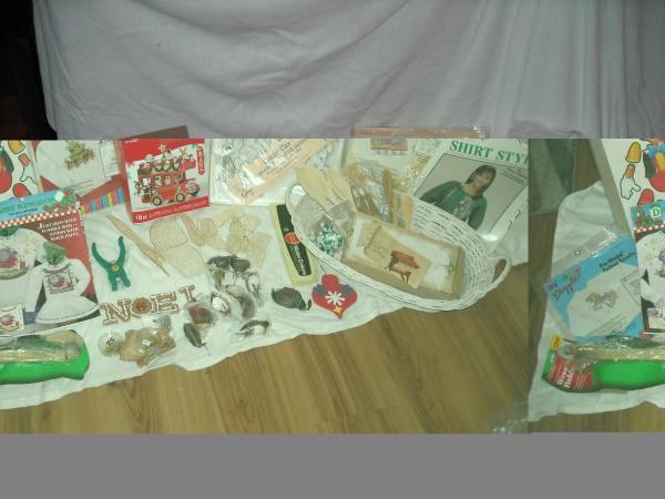 A multitude of various crafting supplies as seen in photos. Wood shapes, silk flowers, mini baskets, birds, bamboo circles, 3' tall twigs and cat tails, T-shirt & sweatshirt painting, etc. Must...