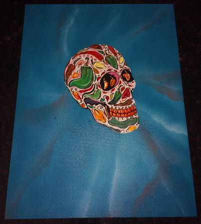 For sale this original painting one of a kind art featuring a skull with spicy chiles, Hand painted, mixed media on canvas, size is 24" X 18" signed and painted by Mexican Artist D.Ayala. Artwork is in good condition. See pictures for reference. Pick up in San Pablo!!!