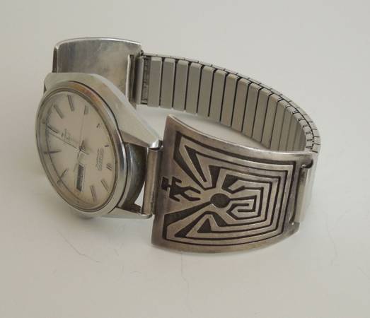 Man in the Maze silver belt buckle and/or wrist watch. Priced separately Belt buckle is $325, watch band is $225 . Bought in late 1980s or early 1990s in Albuquerque. Marked sterling and both have artist’s mark. Belt Buckle 2 ” x 1 1/2 ” Watch band needs some silver polish. Seiko watch is included with band, it works, but no guarantee, I am just including it as is because I stopped wearing a watch since cell phones.