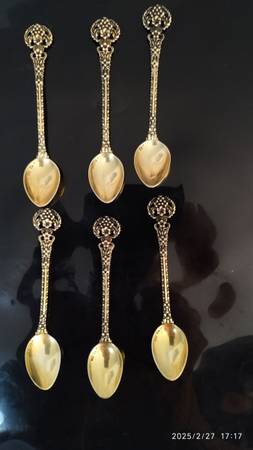 One set of 6 silverware 6-inch tall gold plated dessert spoons never used a beautiful set of about 75 years old . I am asking $$180.00 cash in person. Mike Thanks.