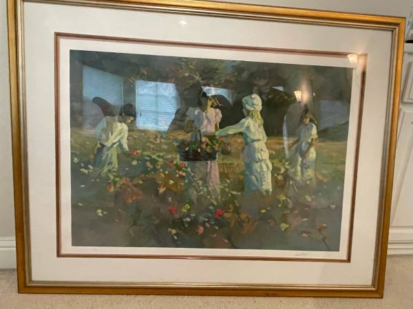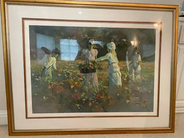 "Children in the Meadow" is a limited edition serigraph on paper by Don Hatfield, It is numbered 120/300 and hand signed by the artist. Includes Letter of Authenticity. Frame 50” x 39", 25" x 36" (image). Fine frame with detailed matting and linen mat. 1990. OBO