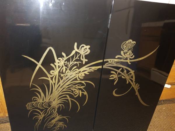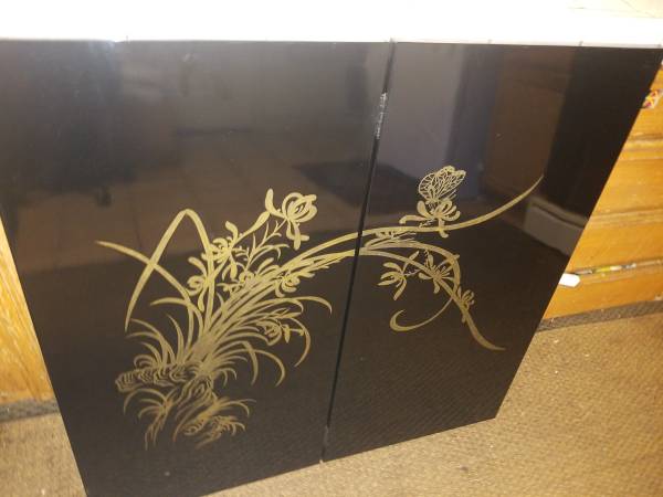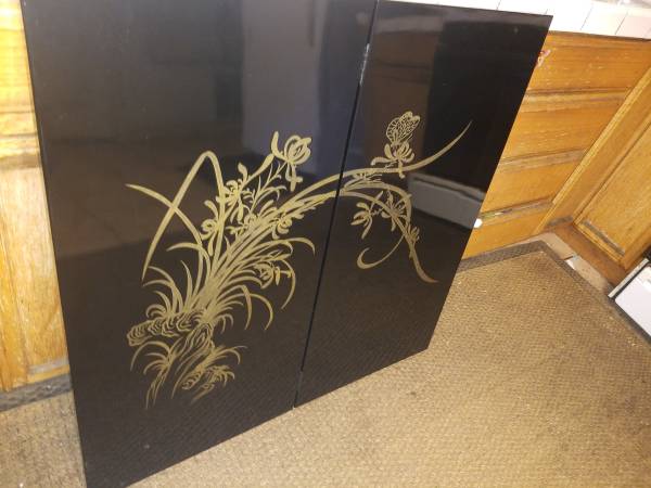 Black Lacquer Asian Panels Orchid Butterfly $500.00 Mid Century 2 Panel 36x36 Elegant and in beautiful condition