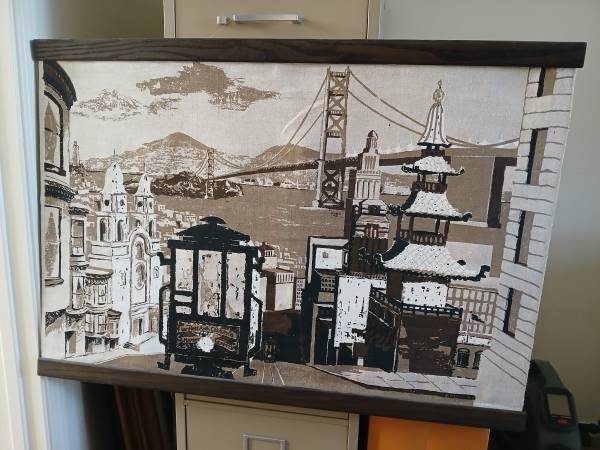 I have a 1960s vintage wall hanging by Robert Bushong of San Francisco. Its in excellent Condition. Stained Wood on the top and bottom. 38"×27".