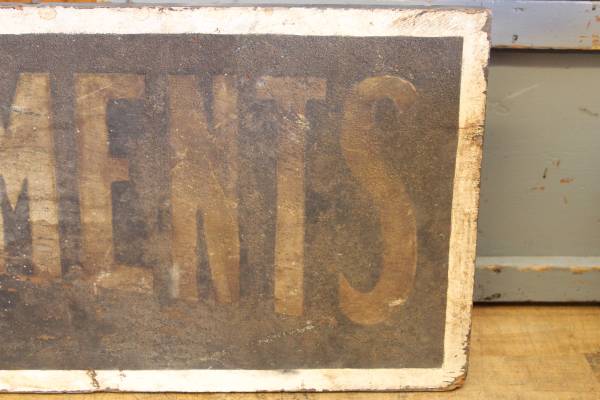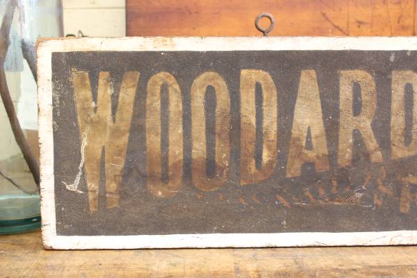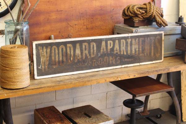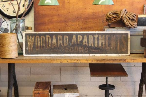 I'm selling this early, smaltz Woodard Apartments/ Rooms sign dating to approx 1900 - 1920s. This sign is one single piece of hand-painted wood and is in good condition for its age. It possesses black sand paint with white text surrounded by a white border. This would have been intended to hang outside a boarding house/ apartment building. This item features wear commensurate with age including scuffs, scratches, faded text, marks etc. Structurally, it's very solid and ready to be hung.