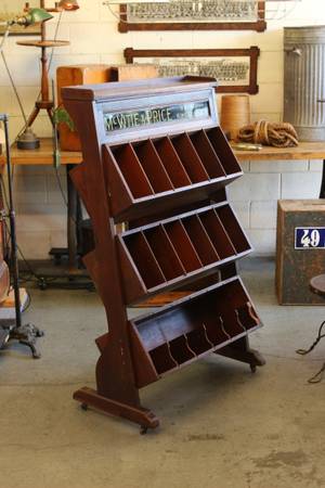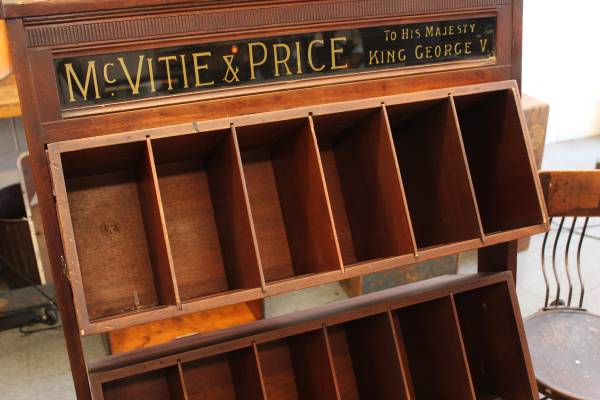 I'm selling this original antique British McVitie & Price country store biscuit display dating to the 1900s - 1910s. This piece features adjustable shelf compartments, steel casters and a stunning reverse painted glass panel. This piece is perfect for a retail store or for displaying clothing/ shoes/ books/ small items. Throughout its life this item has seen some screws replaced, a repair to one leg and other wear and tear commensurate with age including dings, marks, scratches, paint drips, chips etc. Please view the pictures and let me know if you have ant specific questions. A very functional display piece, ready to be put to use in a retail setting or to highlight your favorite collection.