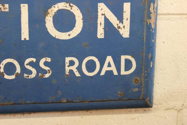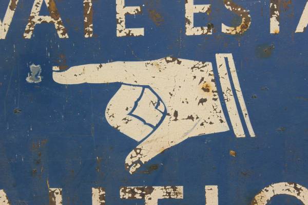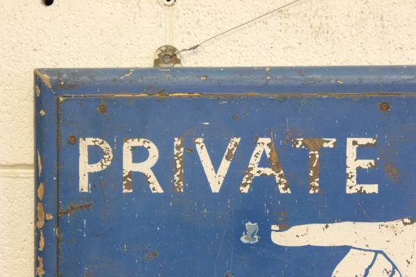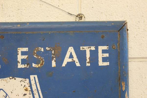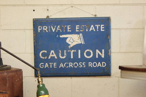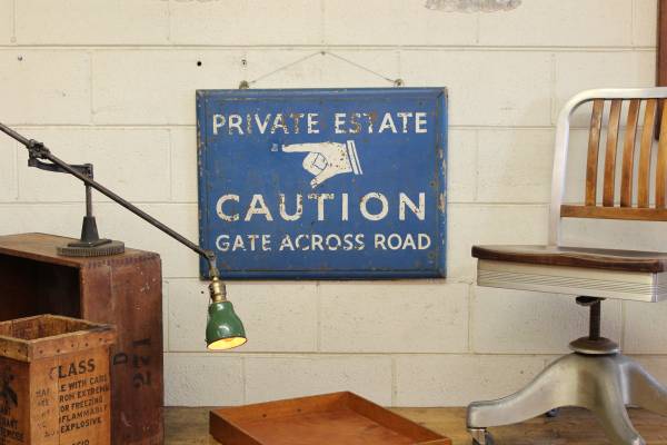 I'm selling this vintage, heavy duty, "Caution Private Estate" sign dating to approx the 1930s/ 40s. The thick wooden frame surrounds a steel, hand painted sign. This hefty item originated from the UK and is in great condition considering the environment it originated from. The graphics depict a manicule (pointing finger) and bold typeface. It demonstrates a wonderful patina with consistent wear across the piece. Solid brass hangers in the back support the wire. It shows wear commensurate with age including chips, dings, paint, scuffs etc; which all add to the character and authenticity of the piece.