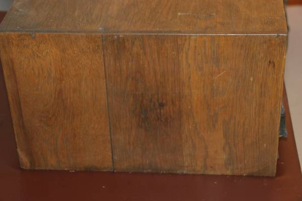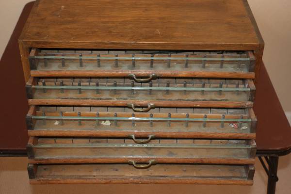Rustic Antique Solid Oak Spool Cabinet , five drawers, one piece of glass on bottom drawer missing. Sold as is. Rustic , but in very good shape. It is a table top design, no legs. It is displayed on a card table for the photo shoot. The drawers work well with maintaining thread spools by color organizing. Great for that dedicate seamstress that takes sewing seriously! I have used it myself in my sewing room, but now have grown into a larger floor model that stores more spools. Pictures included. (one handle is off drawer, but I have it.) A predetermine public location will be where viewing will take place. Cash only please.