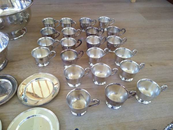 24 pcs EPNS (Electro Plated Nickel Silver) Eugen Ferner 1957 including a big punch bowl, ladle and cups. Most pieces are new. Punch bowl measures 13" diameter x 7"H. Cup measures 3" diameter x 2.5"H.