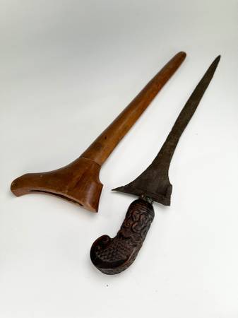 This is a nice antique Indonesian Kris dagger. Made out of layered Damascus steel and has a very nice ornamental look to it. These were traditionally used as ceremonial daggers. The scabbard is made out of some kind of hardwood that has both sap and heartwood showing. The sapwood is yellow while the heartwood is almost ebony black. Take a look at all the photos to see general condition dimensions and weight.