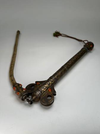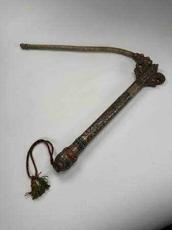 This is an incredible Turkmen horse whip made of silver gilded bronze with incredible inlay work of carnelian and turquoise. It is in fantastic condition considering that it is from the middle of the 1800s and is an incredible work of art. Not only is it beautifully decorated, but it was actually a functional tool for the Turkmen people. Take a look at all the photos to see general condition, weight, and dimensions.