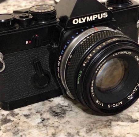 PreLoved ICONIC BLACK ON BLACK 1974 VINTAGE OLYMPUS OM-1 MD 35mm SLR FILM CAMERA F.ZUIKO OM System Auto-S 1:1.8 f=50mm Lens 869690 and Original Leather Case with Neck Strap in Near Mint Excellent Vintage Used Condition. The OM series was the first of its kind and a classic. Clean Prism/No dust. My Dad and myself have been the only owners since purchased new in the 70’s. Camera has been stored properly in its case for its whole life and is in great condition but the leather case does have some cosmetic flaws from regular use (scuffs etc). Please see all photos. Tested, works like new! This particular black on black variant in this condition is very hard to find! Perfect for photographers and collectors. Reasonable Offers Considered. Pick up in Concord (local delivery available).