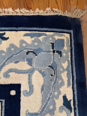 Area rug in good shape. It is large. Blue is the prominent color but off white too. It was in my dining room and was bought in 1970’s or even the 1960’s. We are moving and the new condo has a carpet.