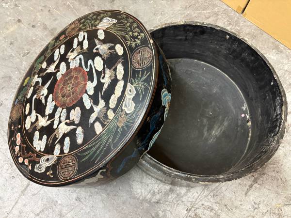 This is a traditional Chinese lacquerware box, likely from the Qing Dynasty or early 20th century, featuring intricate hand-painted landscape scenes on a glossy black background. The cylindrical box with a fitted lid showcases classic Chinese artistic motifs.